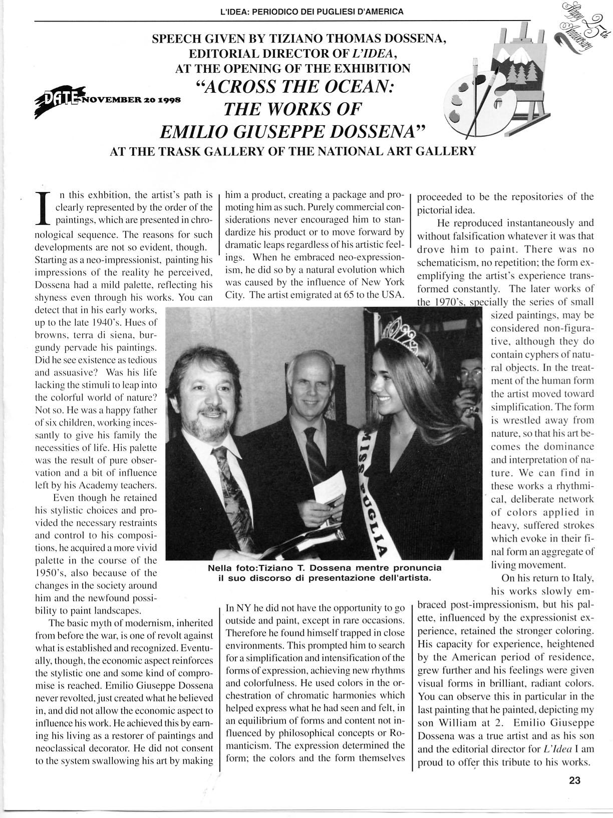 “Galerie Internationale has a current exhibition of the known painter, sculptor, and restorer, professor Emilio Giuseppe Dossena. The artist is known for the musicality and brilliance of his colors and the idealization of his subjects… The exhibit is particularly successful and constitutes a spiritual and aesthetic delight for the visitors…”